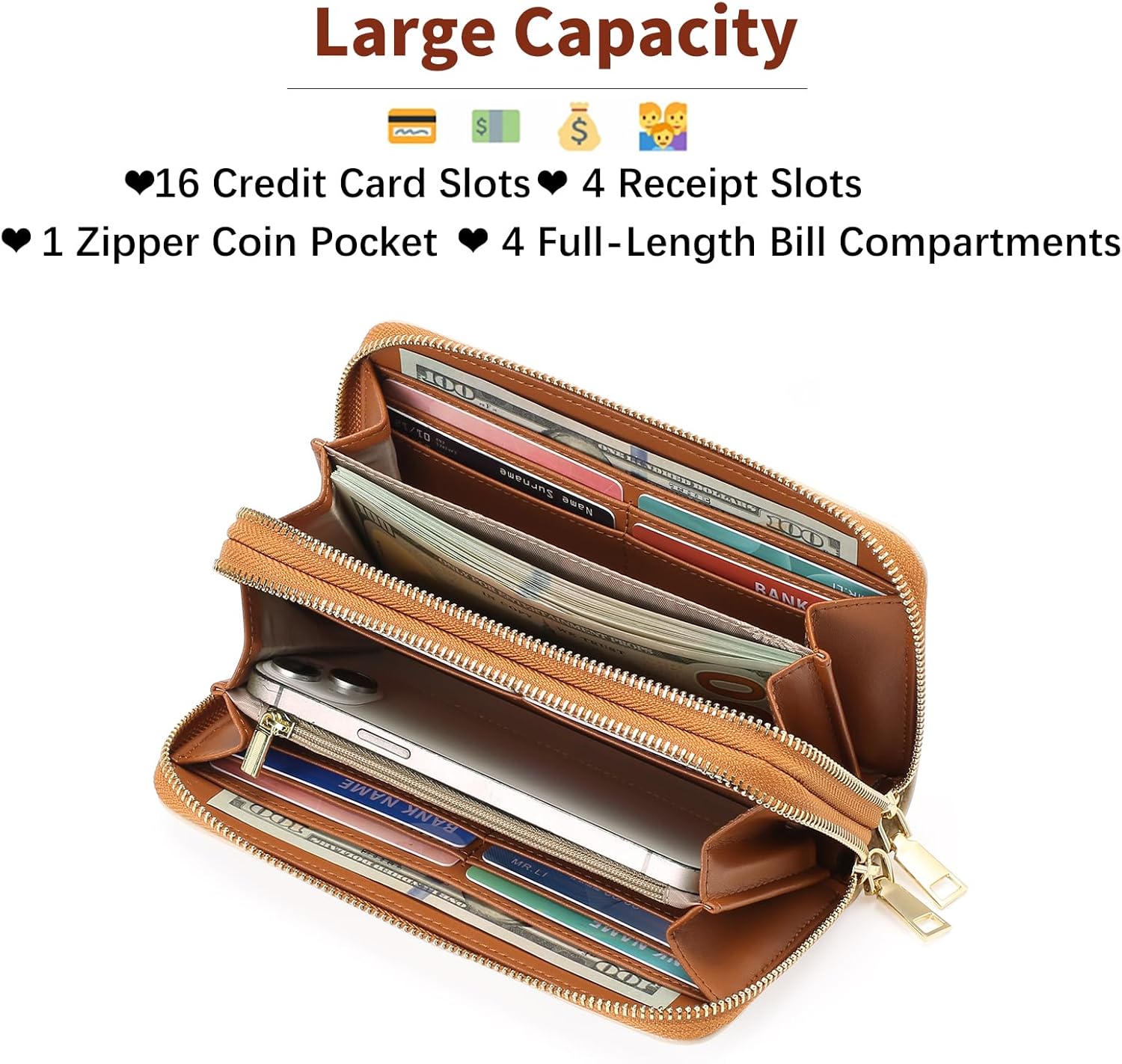 Women’s Wallet Large Capacity Double Zip Ladies Card Phone Holder RFID Blocking Wristlet Leather